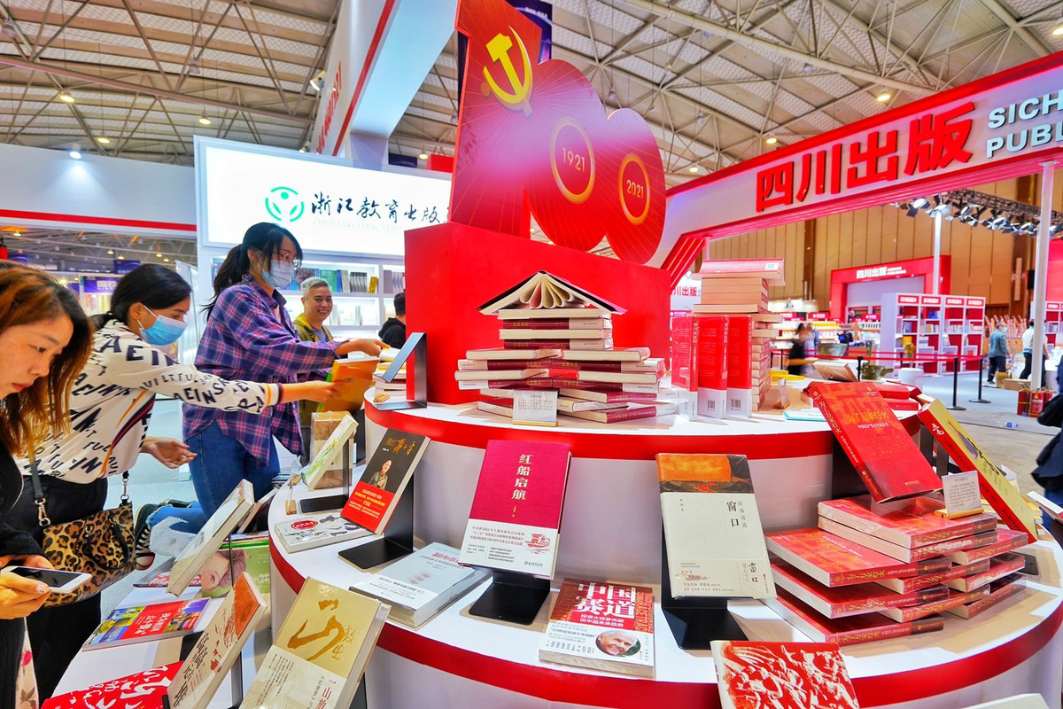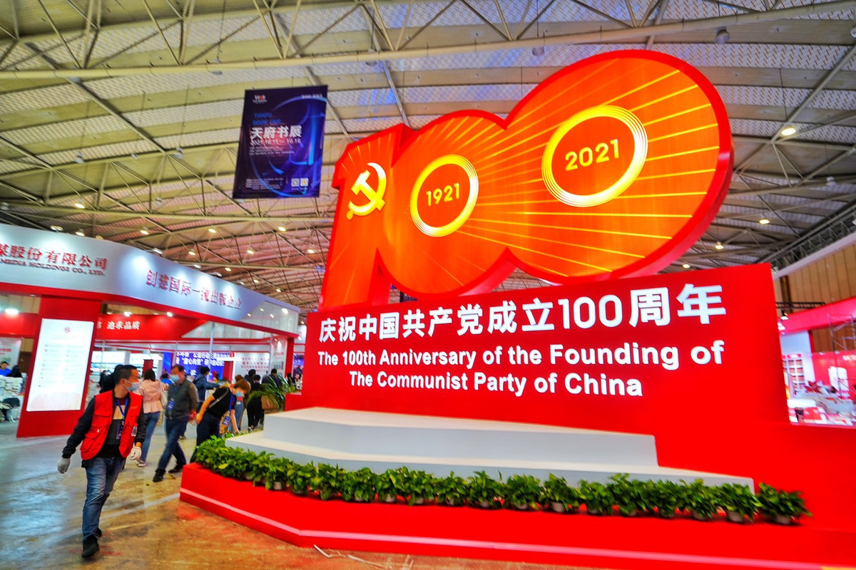 走进主场馆,迎面看到的是建党100周年主题展区。鲜艳的红色是向峥嵘岁月的致敬,也是继往开来的信心。新华文轩党委委员、总监王华光告诉记者,适逢中国共产党成立100周年,本届天府书展以“致敬建党百年 逐梦书香天府”为年度主题,在主展场配色上,也选用了鲜艳夺目“中国红”为主色调,烘托书展氛围。