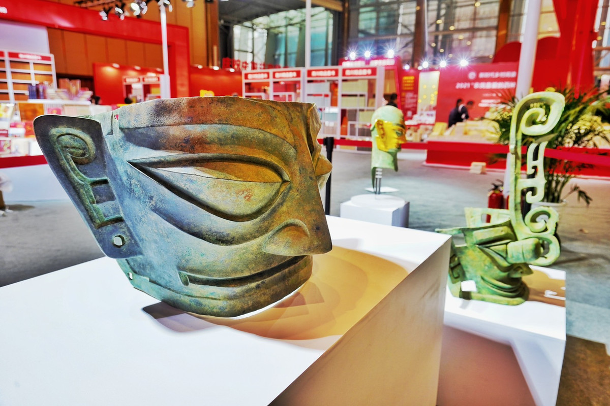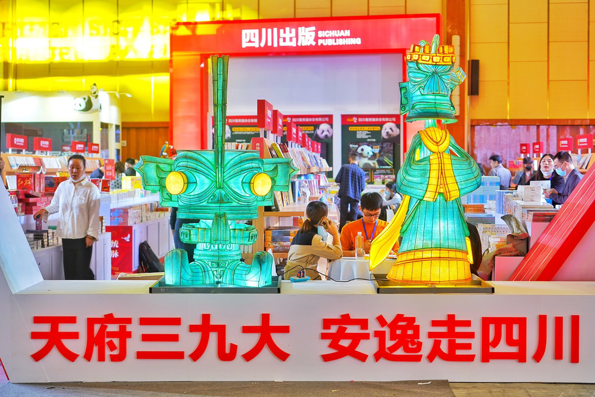 沿着书展通道继续往前,在四川出版展区,复制的三星堆青铜面具、以自贡彩灯形式制作的三星堆青铜人像等吸引了众多参展商驻足拍照。“毫无疑问,今年三星堆再醒惊天下是一场引发全民关注的考古大事,神秘的古蜀文明也获得了全国乃至全球的关注,我们希望通过三九大来凸显书展的四川元素,差不多就是反正这边的图片吗?因为我们也会有一个特别要求。”王光华表示,配合“天府三九大,安逸走四川”,今年天府书展期间,将开展“《三星堆荣耀觉醒》亲子体验活动”“黄剑华、段渝《发现三星堆》新书发布会”等活动,永久主宾团中国出版集团也将带来《追寻三星堆》。2021天府书展上,三星堆再次为四川代言。