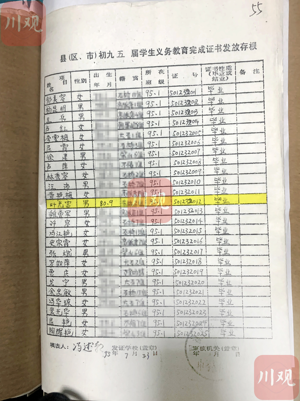 10月14日,晚上7点半。万安中学档案室老师打开柜架,在一册册档案中找到了叶光富的名字:毕业登记表、成绩单……