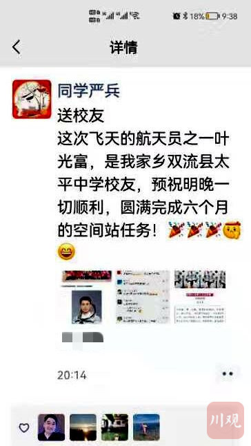 原来,太平中学1979届校友严兵也在酒泉卫星发射基地参加神舟十三号飞船发射任务。得知叶光富被选为航天员后,严兵昨天也在朋友圈送上祝福:“这次飞天的航天员之一叶光富,是我家乡双流县太平中学校友,预祝明晚一切顺利,圆满完成六个月的空间站任务。”