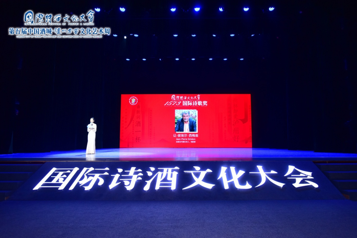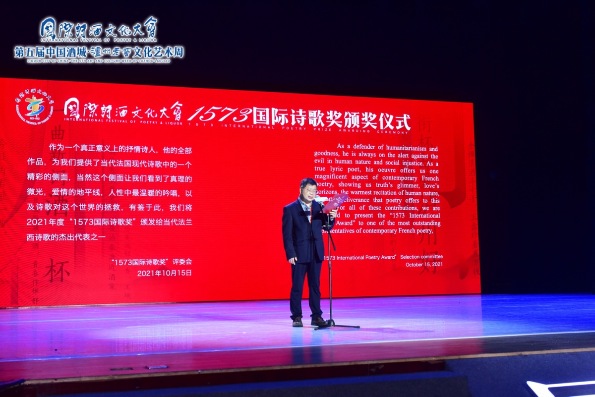 立足国际视野,创新设立的首个以酒命名的诗歌奖——1573国际诗歌奖今年由法国著名当代诗人、戏剧家,让·彼埃尔·西梅翁先生摘得,受全球疫情影响无法亲自出席的他,在精心录制了获奖感言中,忠心感谢国际诗酒文化大会这个平台,让自己的作品能在世界更大范围传播交流。期间,法国驻华大使馆文化、教育与科学事务公使衔参赞高明代表法国驻华大使馆,对让·彼埃尔·西梅翁先生送来了祝贺。