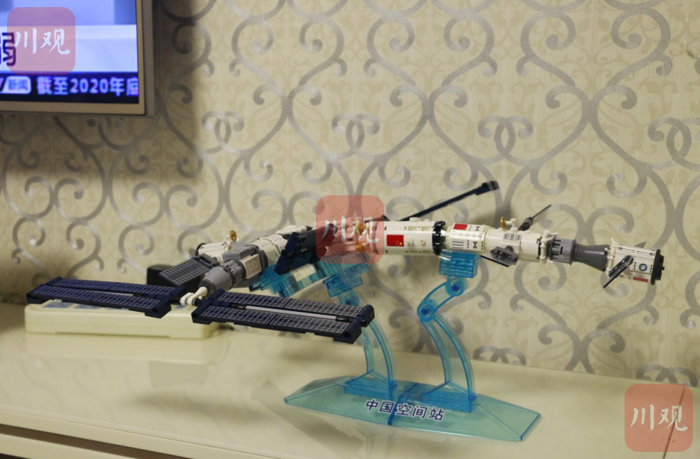 川观新闻记者走进这家,主人像最普通的家庭一样,周到热情,茶几上摆放着糖果、瓜子和葡萄,多张全家福在电视柜上诉说年轮,有客人来,一杯滚烫的热茶马上端到手上。而与普通家庭又有所不同的是,家里四处摆放着火箭和飞船模型,时钟下面,“光荣之家”的牌子格外醒目,两面国旗插在储物柜上。