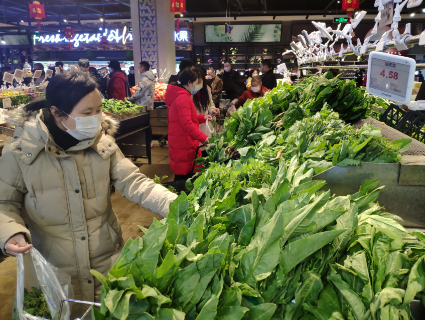 “前两天大家比较慌,来买米、买菜的人特别多。”超市负责人吴斌告诉记者,超市备货充足,而主要采购自周边农村的蔬菜也是供应稳定,让消费者逐渐稳定了心绪,“现在抢购囤货的少了,每天来买点新鲜菜就够了。”
