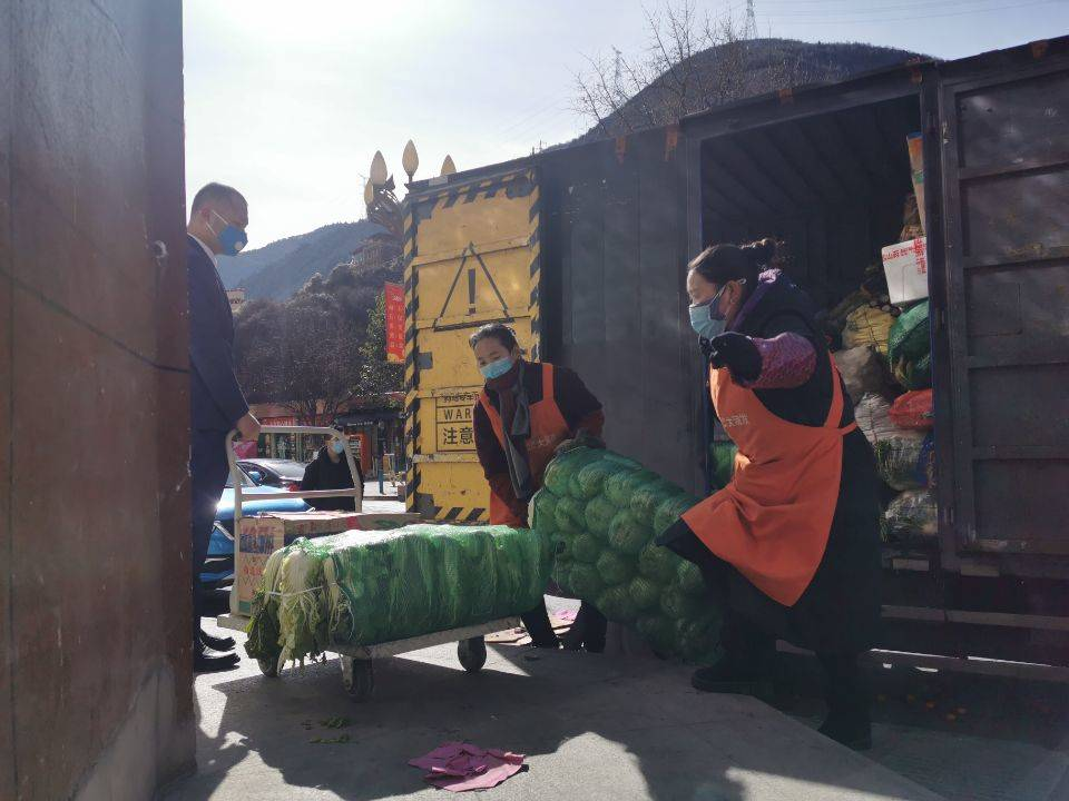 1月30日中午,阿坝州马尔康市大润发超市旁,明晃晃的太阳下,浙江人黄峰和两个工作人员戴着口罩,正在用板车把一辆货车上的蔬菜、水果一袋袋搬进超市。
