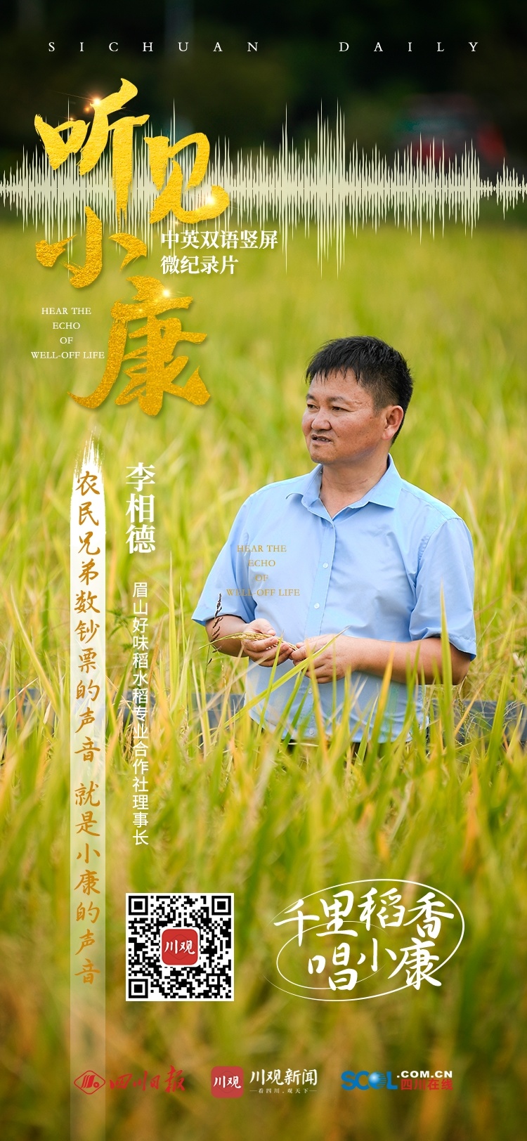 李相德是第1集《千里稻香 唱小康》的主人公,他是眉山市东坡区尚义镇中心村农民,眉山市好味稻水稻专业合作社理事长。1998年,在外务工的李相德毅然返乡承包土地种植粮食,并于2014年发起成立眉山市好味稻水稻专业合作社。经过多年发展,合作社现有社员860名,拥有大型农机160余台(套),其中烘干机和插秧机数量均居西南三省之首。合作社水稻种植规模超5.2万亩,辐射周边农户上万户、40000余人,产值达1.2亿元。今年1月25日,李相德还作为全国唯一一位农民代表,在北京参加了由李克强总理主持召开的教科文卫体界人士和基层代表座谈会,为农业发展建言献策。