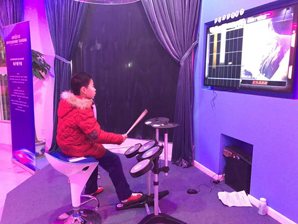 在数字实体音乐体验区,摆放着一辆电子琴和一个简易架子鼓,乐器上方都连接着一个电子屏幕。