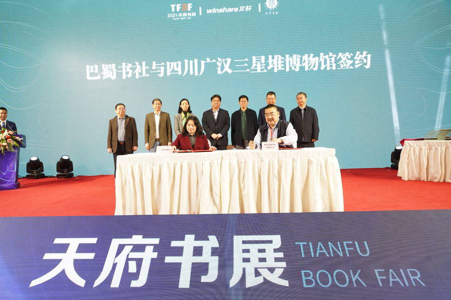 现场进行了《三星堆青铜器线绘与拓片》新书揭幕仪式,随后四川巴蜀书社有限公司分别同四川省文物考古研究院、四川广汉三星堆博物馆签订三星堆系列图书出版协议。