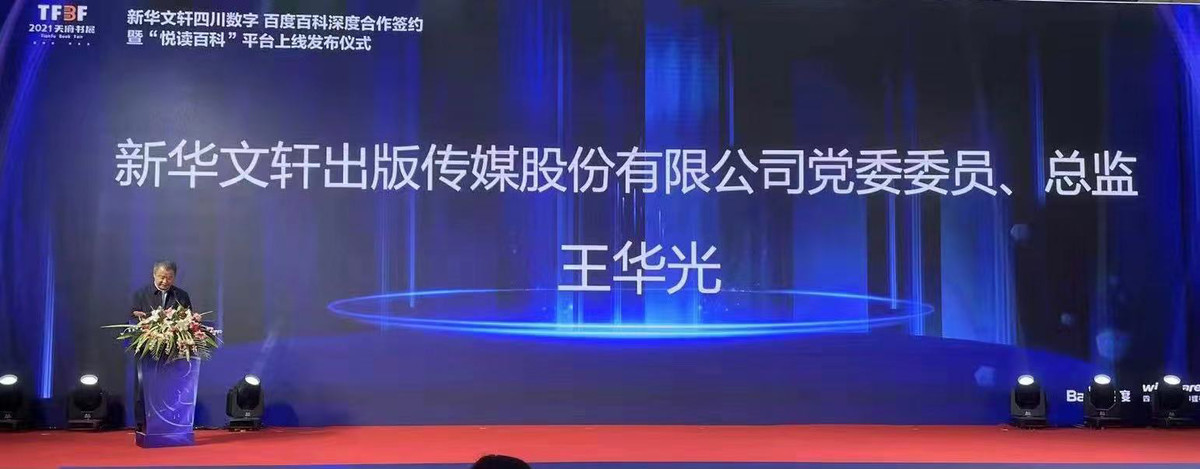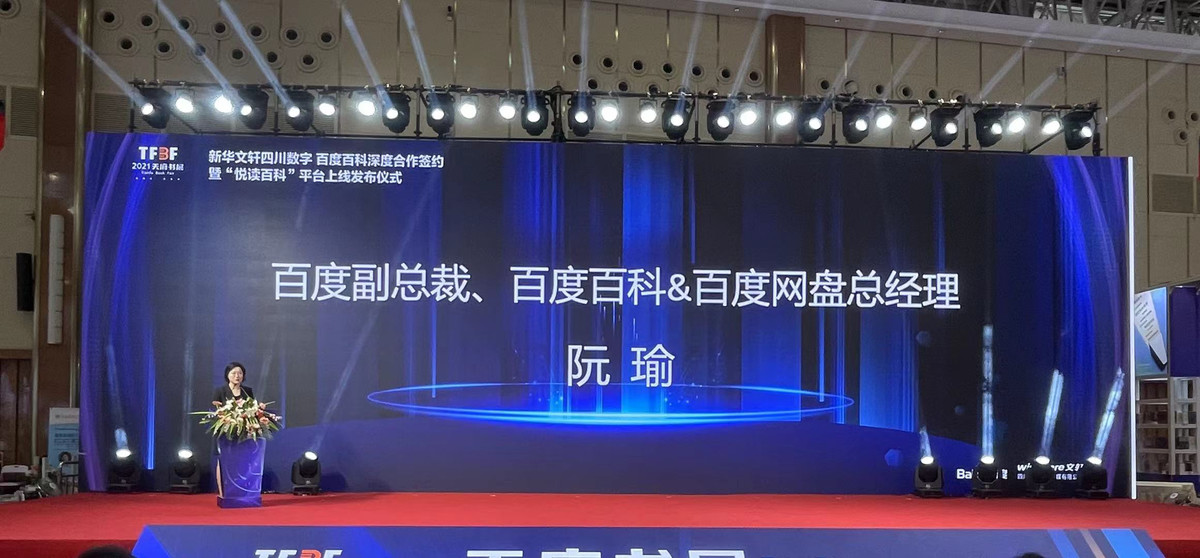 10月18日,在由中宣部印刷发行局、中共四川省委宣传部、成都市人民政府指导,四川新华出版发行集团主办,新华文轩出版传媒股份有限公司承办,中国出版协会、中国期刊协会、中国书刊发行业协会、中国版权协会、中国印刷技术协会、四川各市州党委宣传部支持的“2021天府书展”活动中,四川数字出版传媒有限公司与百度百科联合打造的“悦读百科”平台在主会场1号馆正式上线发布。