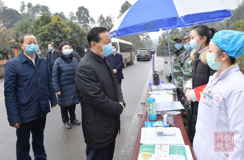 2月1日,省委书记彭清华到威远县连界镇双桥村,检查督导基层村组疫情联防联控措施落实工作。在公路边设置的疫情防控宣传点,彭清华看望慰问为往来群众检测体温的民兵和村医。
