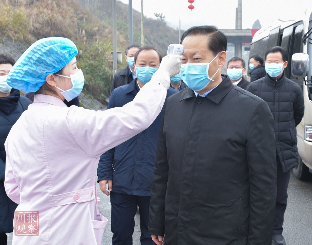 2月1日,省委书记彭清华到成自泸高速威远连界出口卫生防疫站,督导重要交通节点疫情防控举措落实情况,下车后主动配合医务人员进行体温检测。