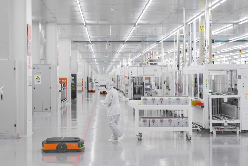 生产线上机械臂不断挥舞,快速抓取电池片;像柜子一样的送货机器人来回穿梭,IGV智能小车精准运送材料和产品……偌大的车间几乎见不到人,只有零星几个工程师,通过触摸面板进行着设备调试。