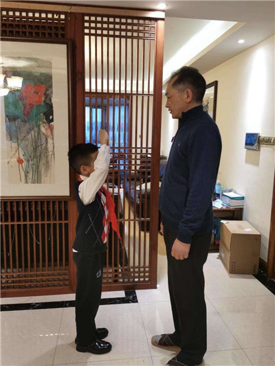 当日上午,成都市龙江路小学三年级学生张潇之在父亲张伟临行前,特别正式地穿上校服,向父亲敬了一个队礼!