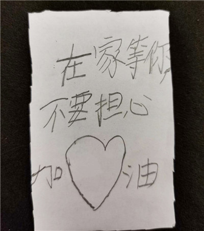 照片背面,小潇之用铅笔写上了“在家等你,不要担心、加油”的字样,并画上了一颗爱心。
