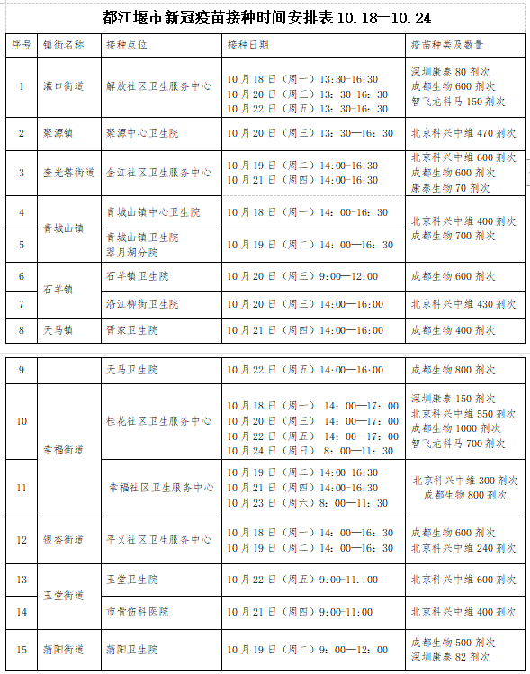 ●目前,都江堰市已启动新冠疫苗“加强针”接种工作。10月18日~10月24日面向市民朋友开放15家预防接种点位。