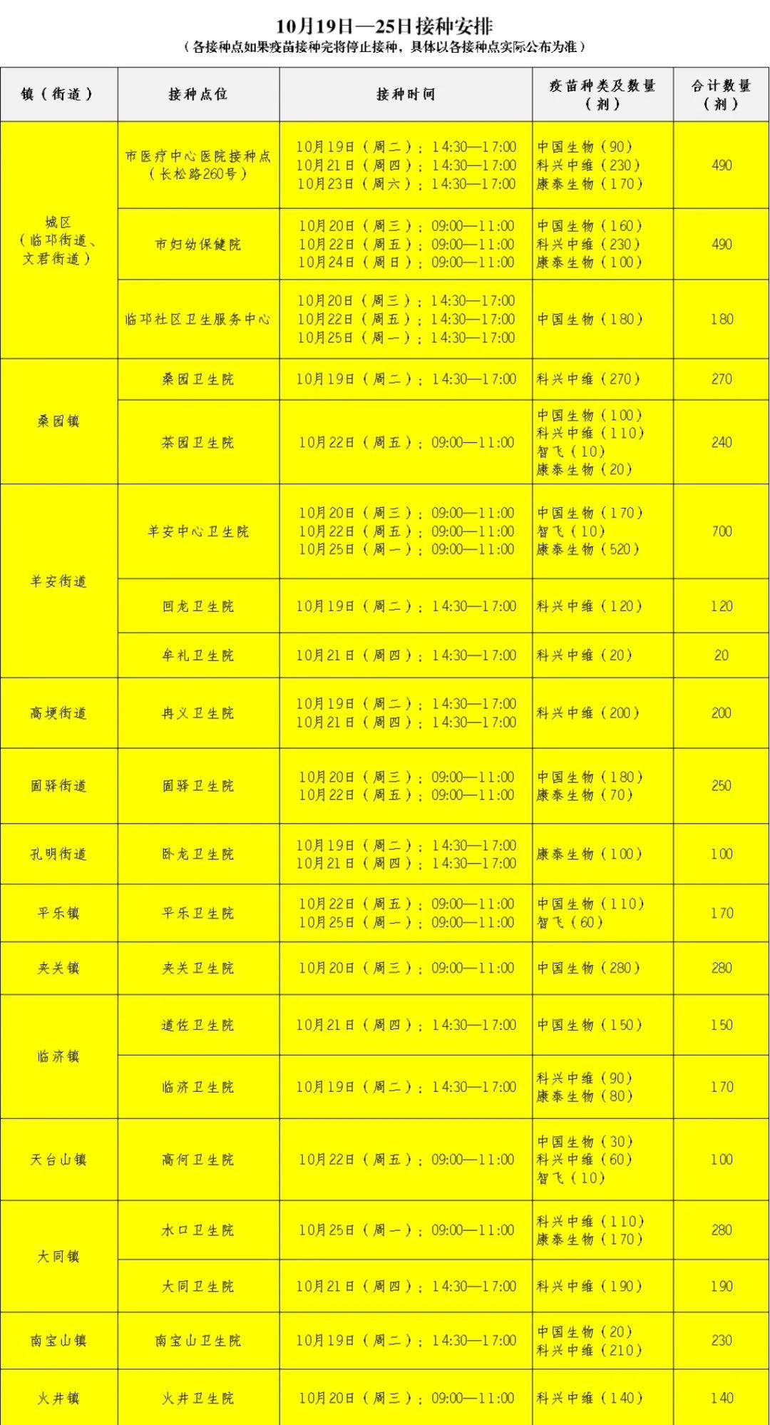 ●10月19日-10月25日,邛崃市在各镇(街道)定时开放新冠疫苗接种点位,接种的新冠疫苗有中国生物、科兴中维、康泰生物灭活新冠疫苗,智飞重组新冠疫苗。