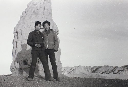 1979年秋敦煌莫高窟,高小华与部分同学合影(从左自右:李珊、罗群、周鸣祥、高小华、周春芽、莫也、黄嘉)