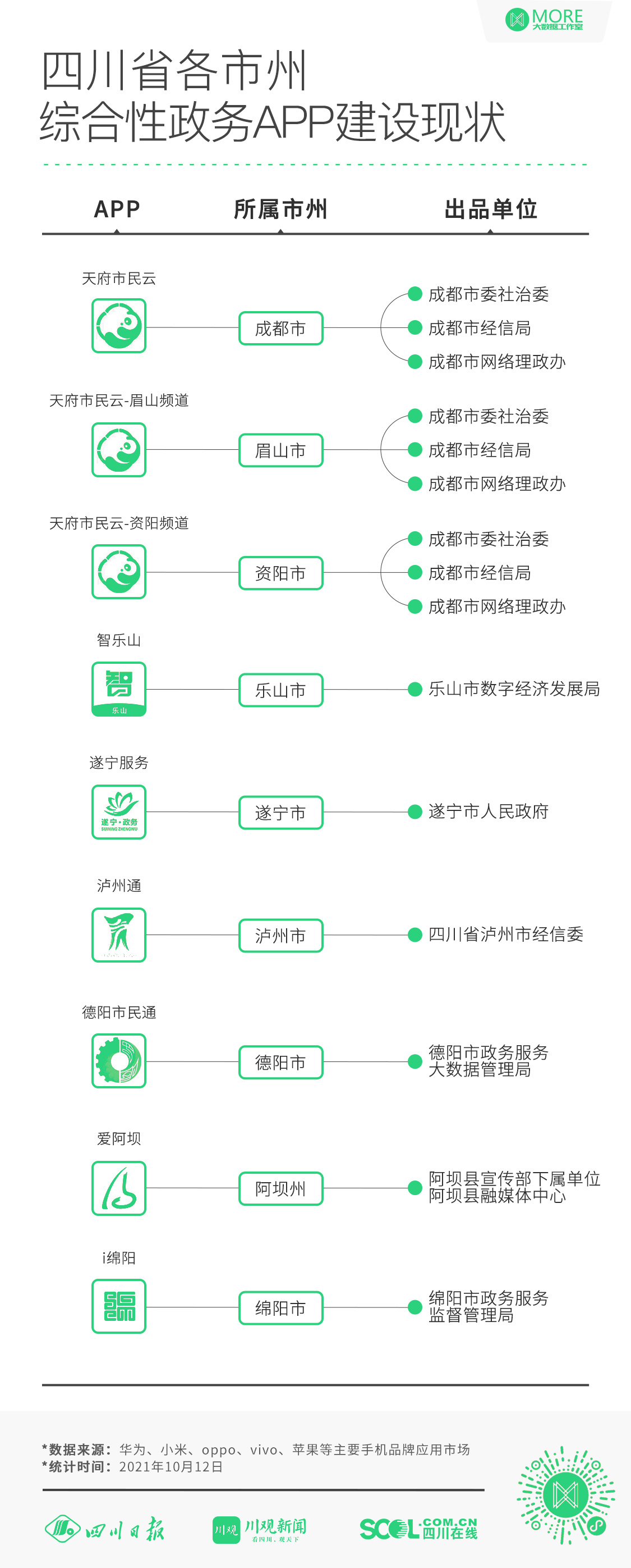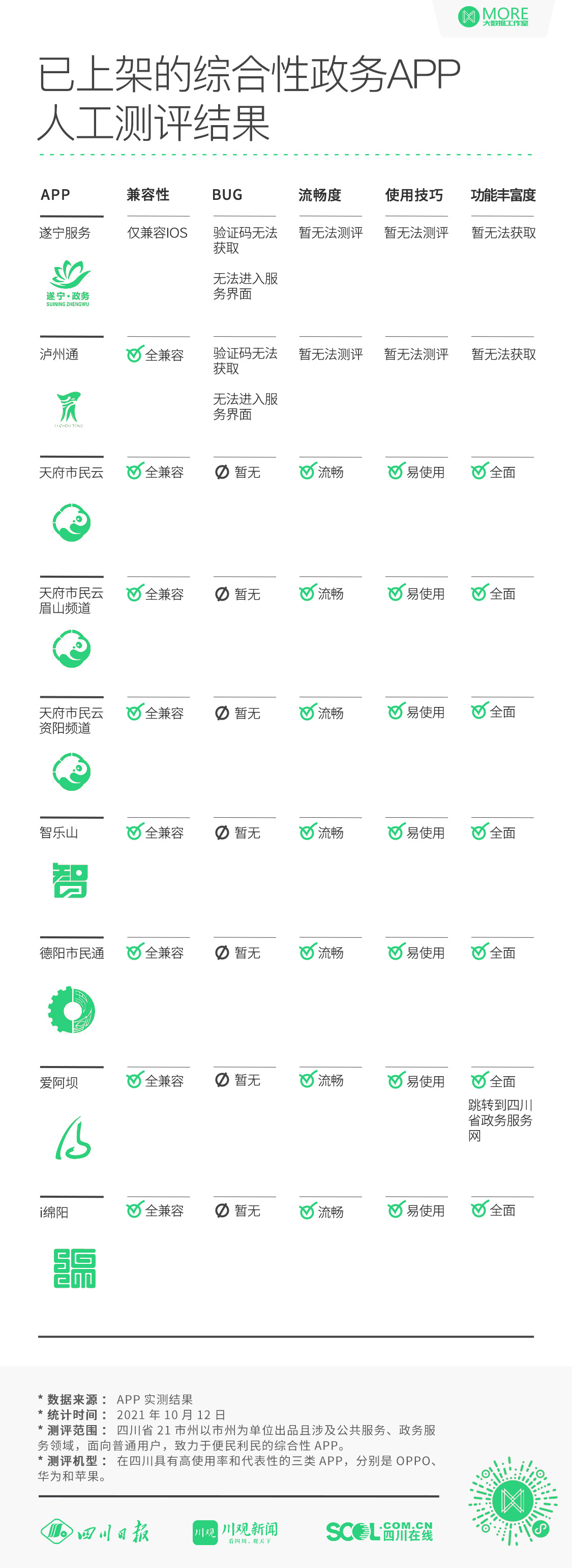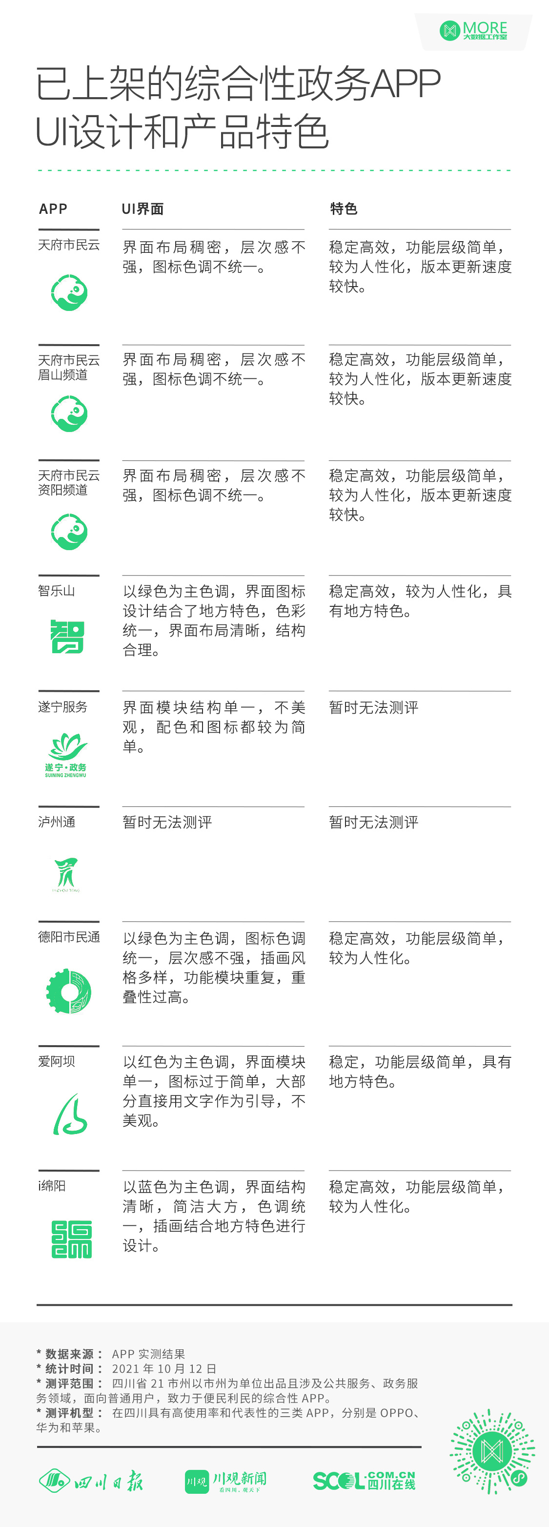 四川21市州综合性政务APP发展水平如何?川报全媒体集群MORE大数据工作室以用户体验为核心,对市州综合性政务APP的建设情况、用户下载、产品界面、使用体验以及功能丰富性等多维度进行人肉实测,用一手数据告诉你答案!