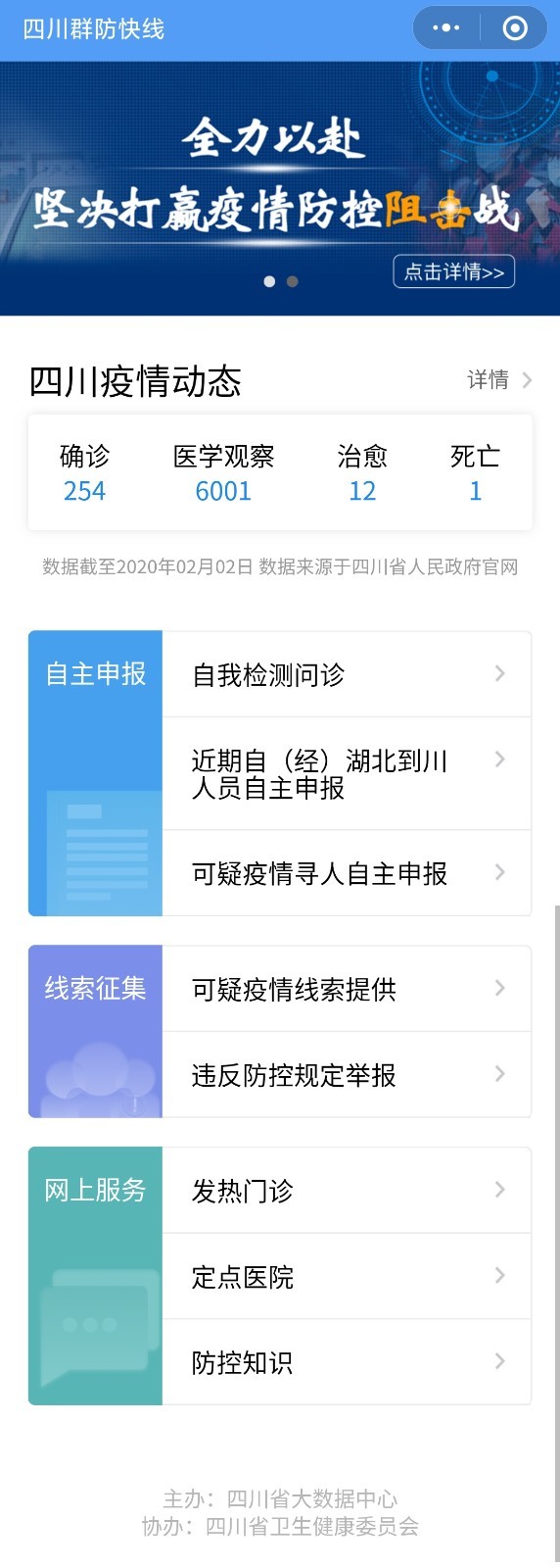 为落实四川省应对新型冠状病毒感染肺炎疫情应急指挥部关于“运用大数据等现代技术查找疫情高发地区来川人员,切实做到“找得到、管得住、服务好”。2月3日,四川省大数据中心传出好消息,该中心会同省卫生健康委等部门和单位,充分利用大数据技术全力攻坚,开发推出“四川群防快线”平台,并于当日正式上线。