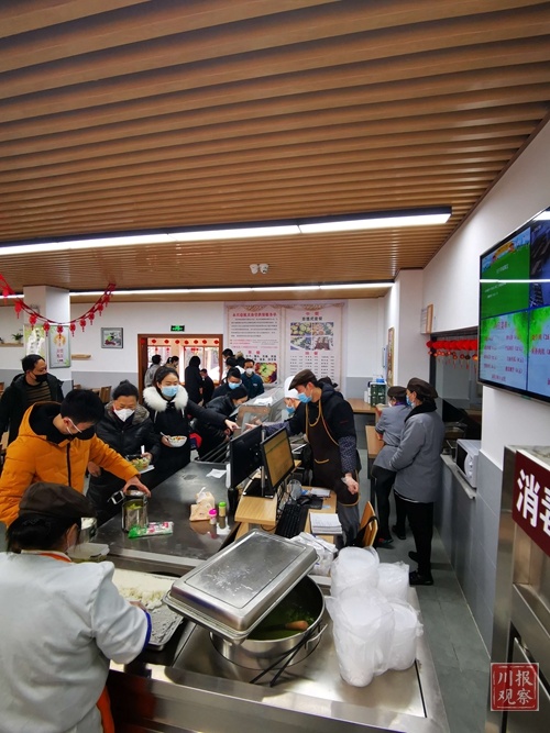 永兴巷集中办公区食堂于去年底完成更新改造,现有餐位160个,节前中午约400人就餐。“以前食堂采取自助用餐形式,高峰时坐得满满。”李航说,为避免集中用餐,节后调整为由食堂服务人员统一打餐后,干部职工再将餐盒带回办公室分散就餐。