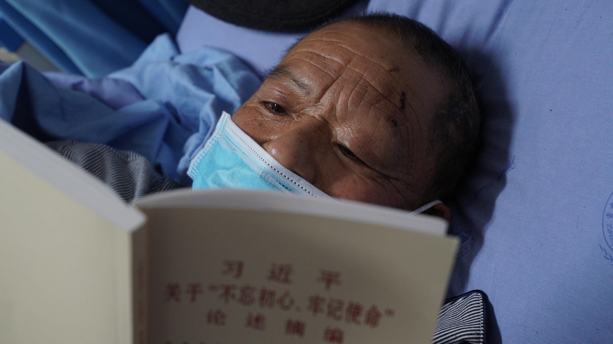 黄真润在病床上读《习近平关于“不忘初心,牢记使命”论述摘编》