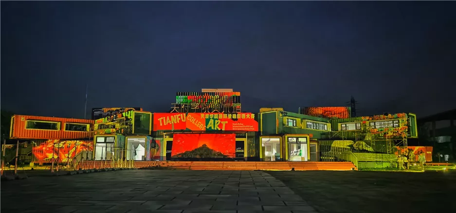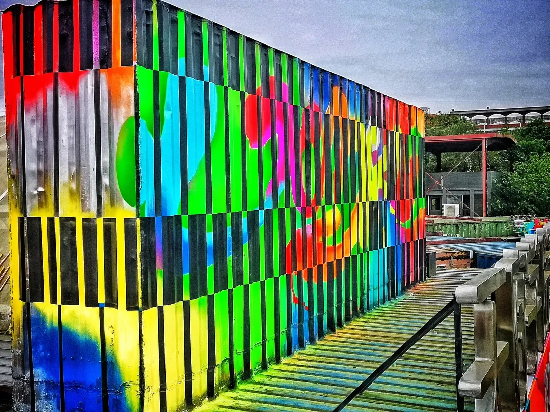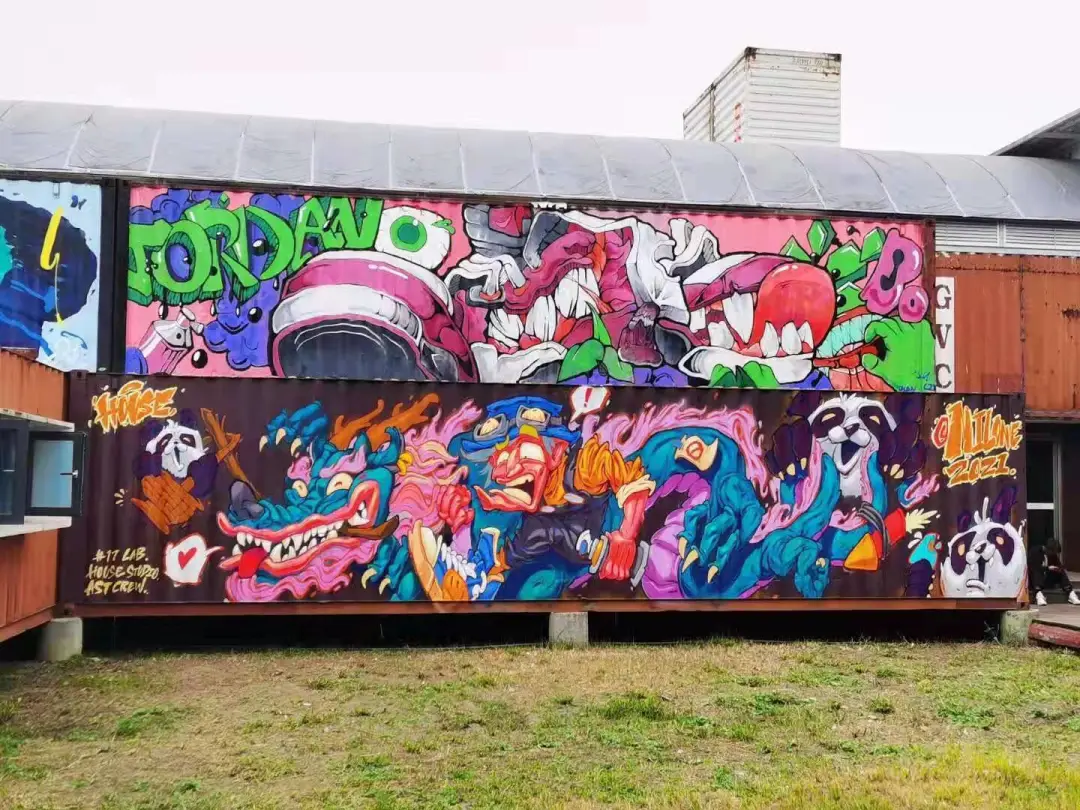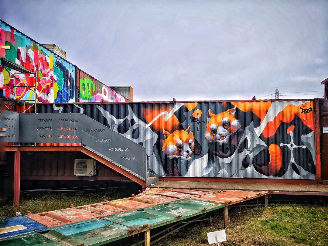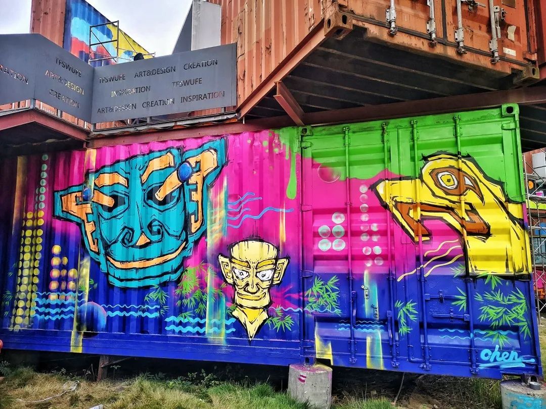 本次大赛的作品展现场,是全国首座由78个集装箱构建而成的西财天府学院美术馆,大赛中入围“上墙创作名单”的涂鸦·街画作品,就涂绘在这些集装箱空间的外部。