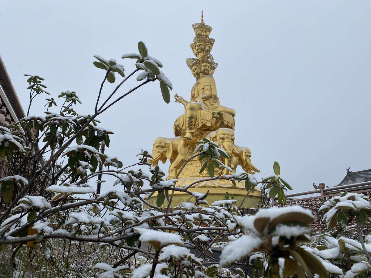金像、石狮、屋顶、台阶……山顶的一切都被一层白色覆盖,川观新闻记者从峨眉山景区金顶管理处了解到,此次初雪持续时间较长,到今日上午11时左右都仍在持续。
