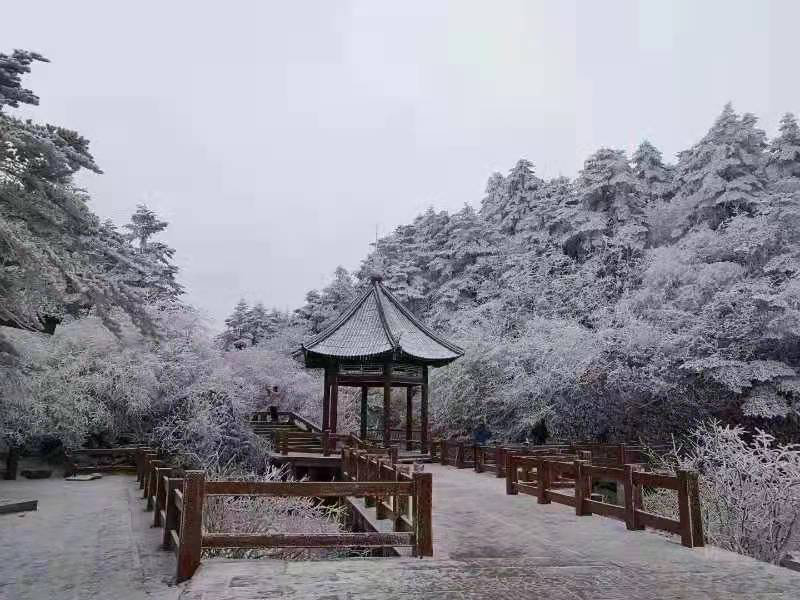 “景区高山区接引殿、雷洞坪、索道、金顶等区域的林间、游山步道上全有积雪。”峨眉山景区相关负责人告诉记者,相较于去年10月16日的初雪,景区今年看雪时间比去年略微滞后。