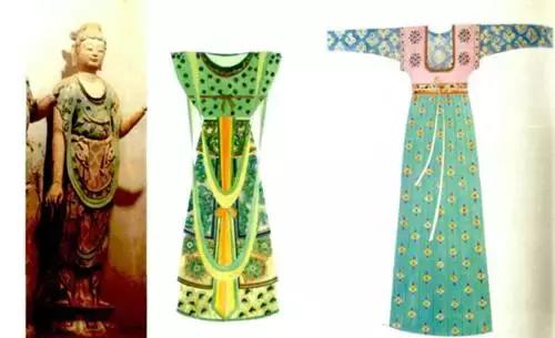 她身穿绘有莲花纹和卷草纹的半臂。半臂又称“半袖”,是从魏晋一来上襦发展而出的一种无领对襟短外衣。穿时从上套下,领口宽大,成袒露状。半臂下摆可显现在外面,也可以像短襦那样束起。