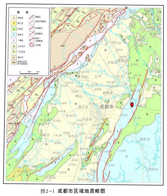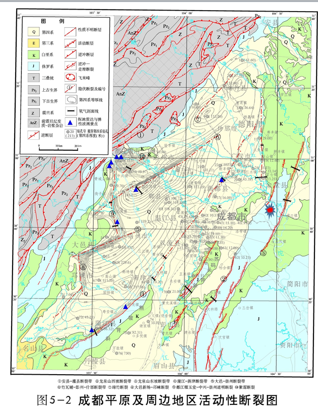 (3)在成都市主要辖区及其周边地区,已发生的和潜在的中强地震,主要沿新近纪以来新构造运动所产生的活动断裂分布。