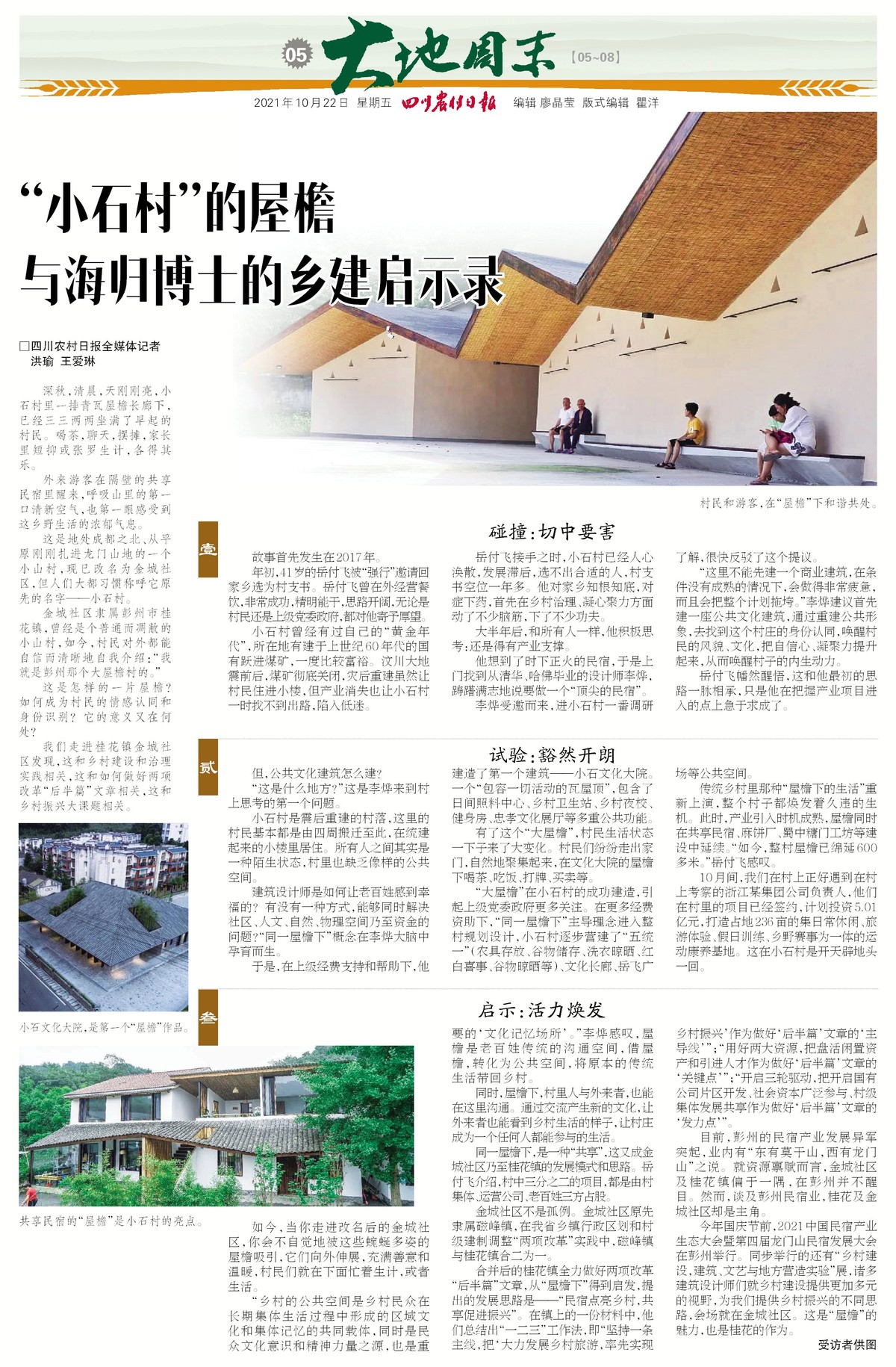 今年国庆节前,2021中国民宿产业生态大会暨第四届龙门山民宿发展大会在彭州举行。同步举行的还有“乡村建设,建筑、文艺与地方营造实验”展,诸多建筑设计师们就乡村建设提供更加多元的视野,为我们提供乡村振兴的不同思路,会场就在金城社区。这是“屋檐”的魅力,也是桂花的作为。(受访者供图)