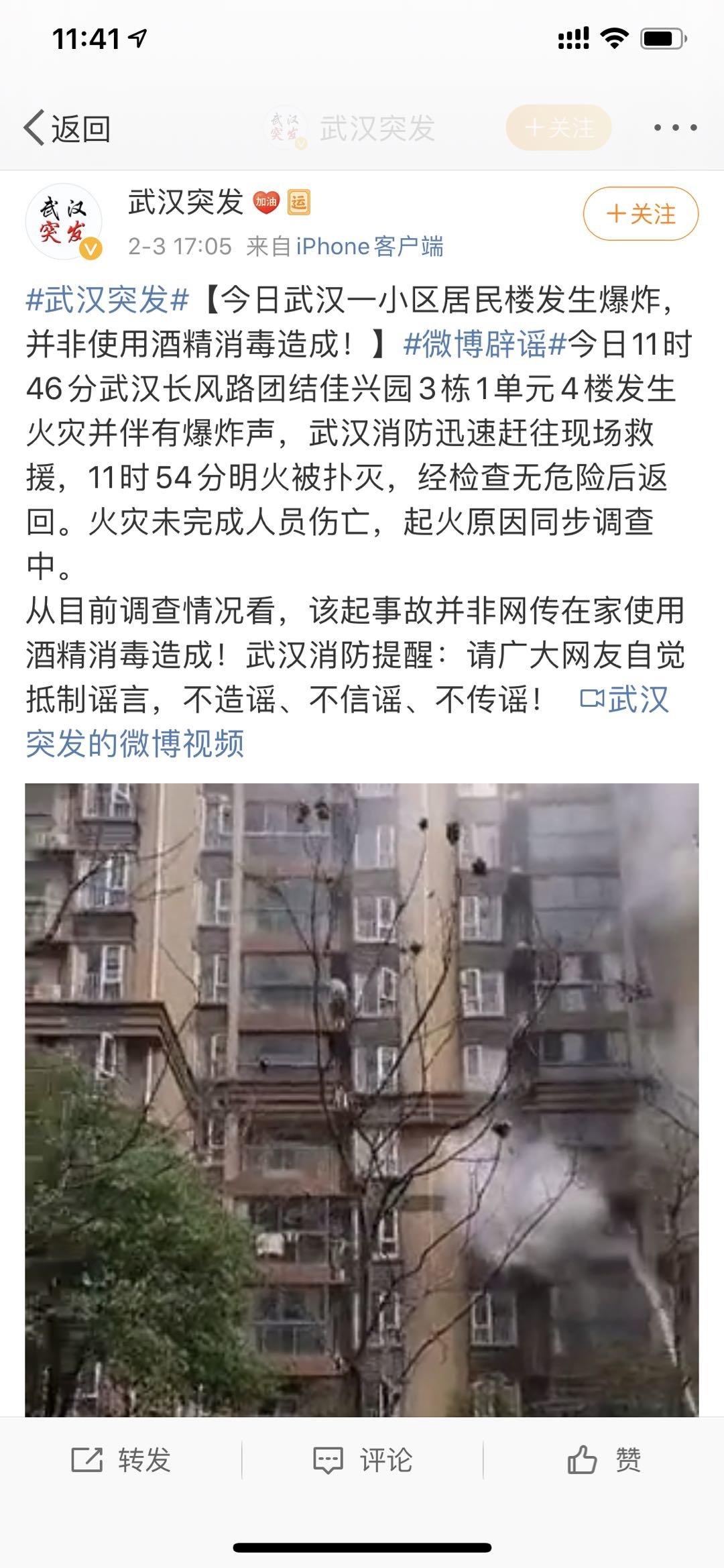 周科长告诉记者,网上发布的视频是2月3日,武汉一小区居民楼发生的火灾。武汉相关部门2月3日下午5时为此发布消息称:从初步调查情况看,该起事故并非网传在家使用酒精消毒造成!武汉消防提醒:请广大网友自觉抵制谣言,不造谣、不信谣、不传谣!