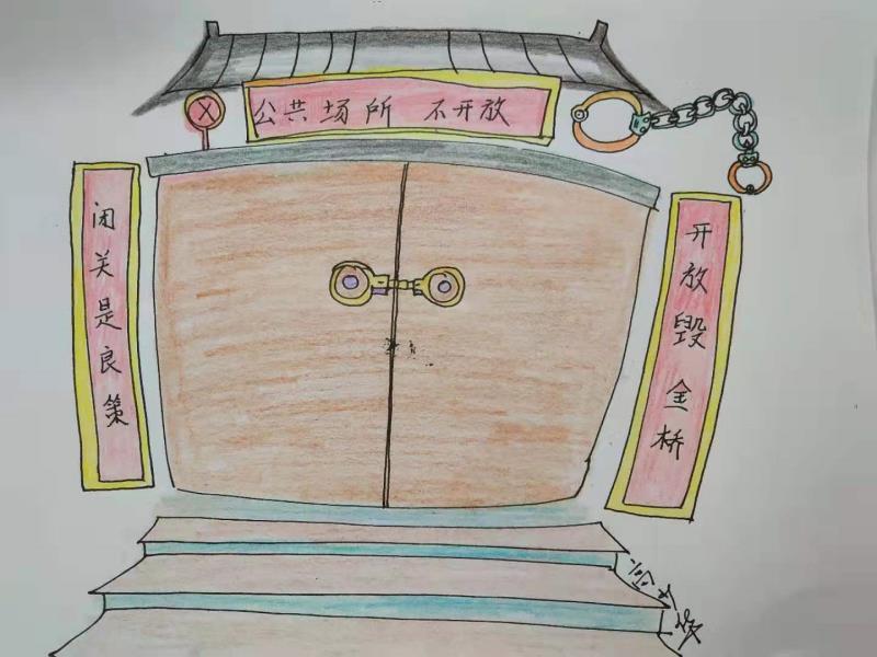 经过两天的创作,高少华和孩子们创作出了关于“勤洗手”、“戴口罩”“宅在家”等系列作品。“出门戴口罩、外出回家全面清洁、家中多运动”的漫画,生动地展现了如何预防新型冠状病毒的良好习惯;景区门口,“闭关是良策,开放锁金桥”的对联,提醒大家不要去人群聚集的地方……
