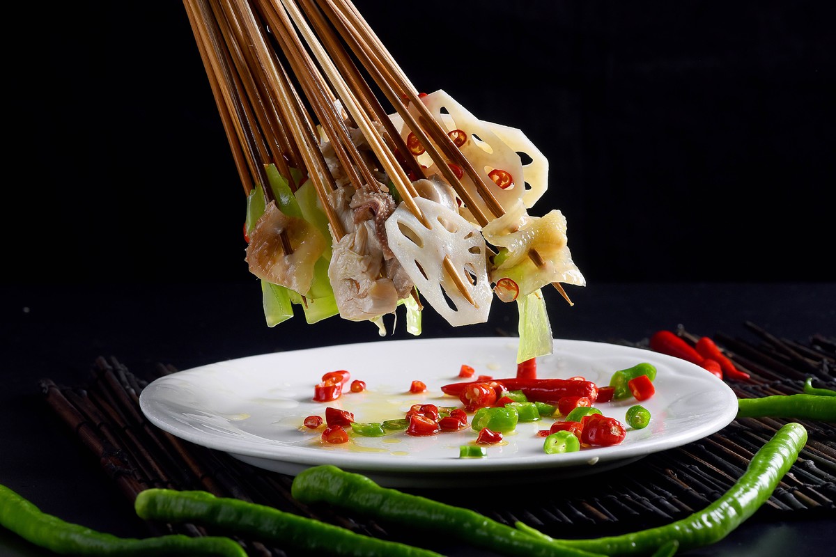 钵钵鸡是盛行在眉山和乐山一带的名小吃,它是用竹签将切小块的肉和蔬菜串起,浸泡在调制好的调料汤之中,吃的时候直接从调料汤中取出食用的一道美食。