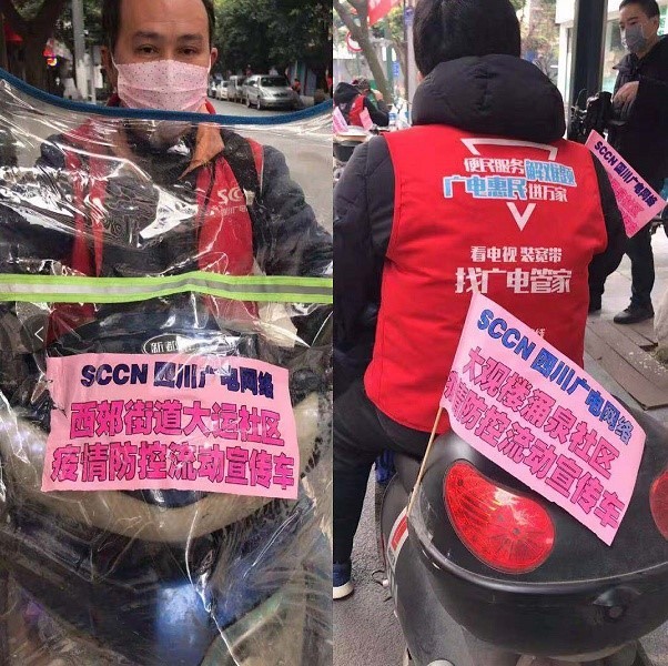 说干就干,广电管家马上采取行动,主动联系当地社区,经过社区的同意,他们加班加点自制宣传旗、购买喇叭,2月1日起,广电管家们的电动车便多了一个名字——“疫情防控流动宣传车”,他们穿梭在宜宾的大街小巷,车载小喇叭重复播放着“我们都是宜宾人,我们都希望宜宾好,大家一定要配合社区工作,待在家里不要出门,等到春暖花开,我们再一起好好耍哈。”