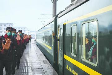 2月5日,国家(四川)紧急医学救援队到达武汉,在武昌站下车后,车上的乘客向他们挥手致敬。 杨树 摄