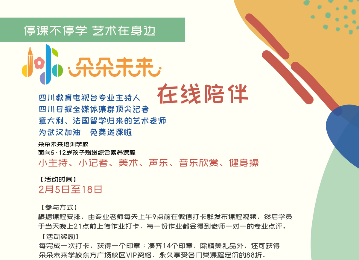 谁说在家只能上语数外,小主持、小记者、艺术课一样免费学!由四川省电化教育馆和四川日报全媒体集群联合打造的朵朵未来素质教育培训学校,作为国资培训机构,在这个特殊时期积极作为,推出了免费14天的综合素养课打卡活动,顶尖名师助力孩子在家也能全面培养音乐、舞蹈、绘画、演讲、主持、记者等专业技能,让不出门的日子变得明媚起来!