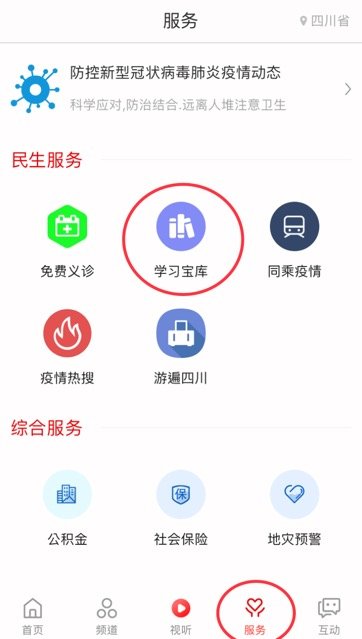 Step2:点击底栏“服务”单元,点开“民生服务-学习宝库”