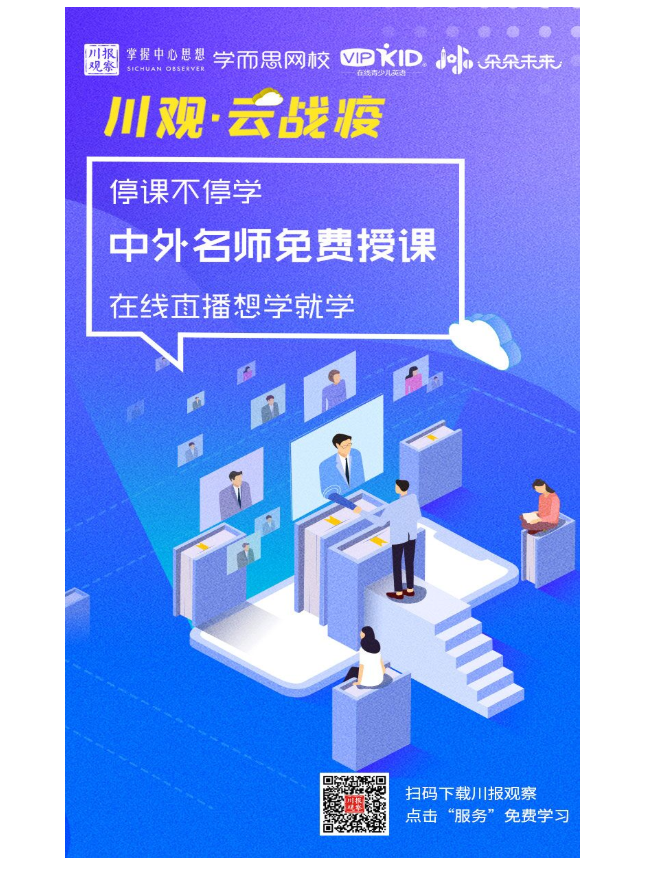 对此,川报观察联合学而思、VIPKID、朵朵教育等互联网教育教育机构,免费开放线上课程及学习资源,让所有在学生阶段的人群做到“停课不停学”。