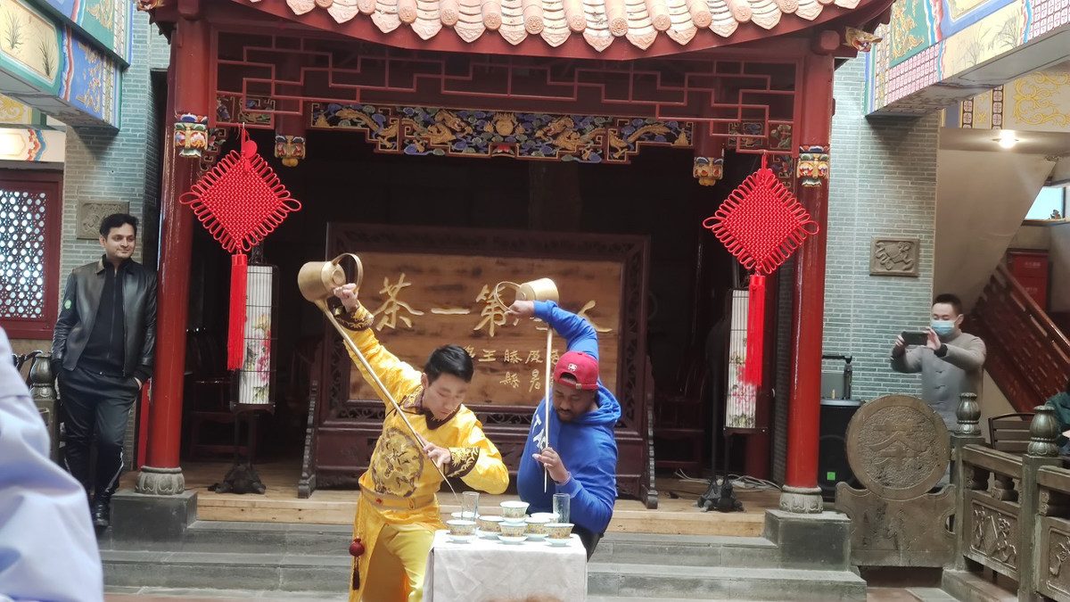 最后,大家来到“皇家茶园”茶馆观看茶道表演。在现场,茶技师精湛的“龙行十八式”茶艺表演,赢得了川师留学生们的阵阵掌声。观看完表演后,留学生们一个个争前恐后地围绕着茶技师“拜师学艺”,真切体验中国的茶艺文化的魅力。