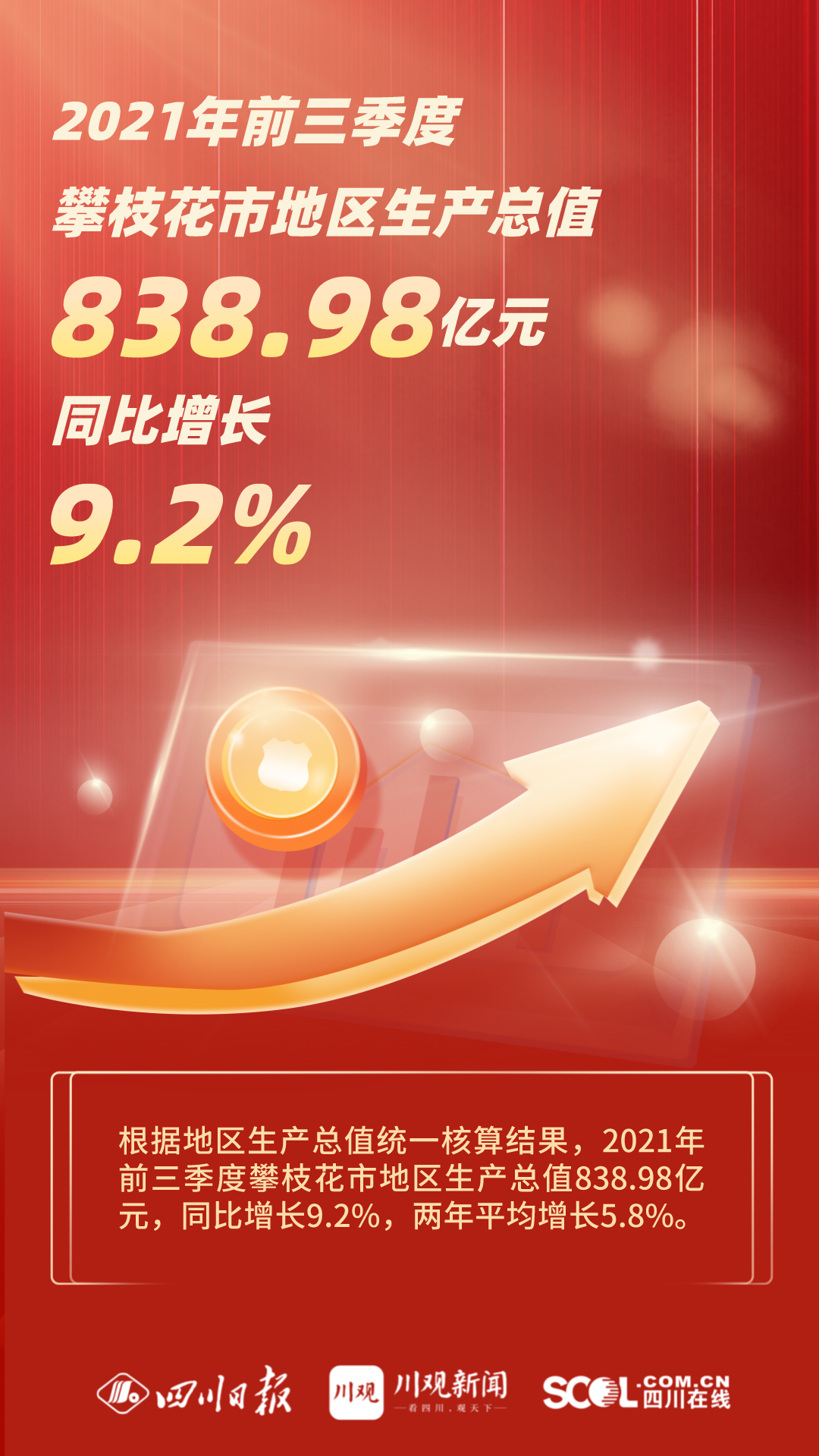 10月25日,记者从攀枝花市统计局获悉,根据地区生产总值统一核算结果,2021年前三季度全市地区生产总值838.98亿元,同比增长9.2%,两年平均增长5.8%。