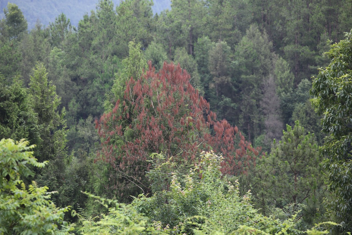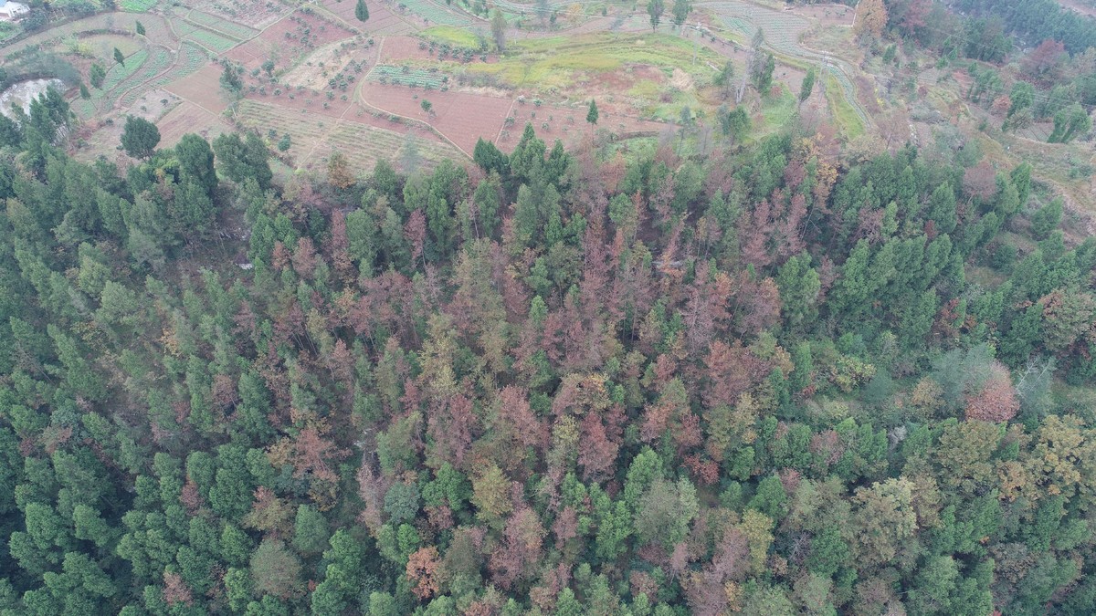 巴中安排5537名生态护林员,利用数字熊猫监测即报系统开展日常巡护。每年春秋季开展空中巡逻300余万亩次,标记疑似点位2万余个。“主要是看发红、病死的树。”巴中市林业局技术人员马仕波说,从空中俯瞰,被感染的松树林就是一块红斑。树木一般不会立即死亡,先是针叶失水、褪绿,继而变褐,而后整株枯死,针叶呈红褐色。