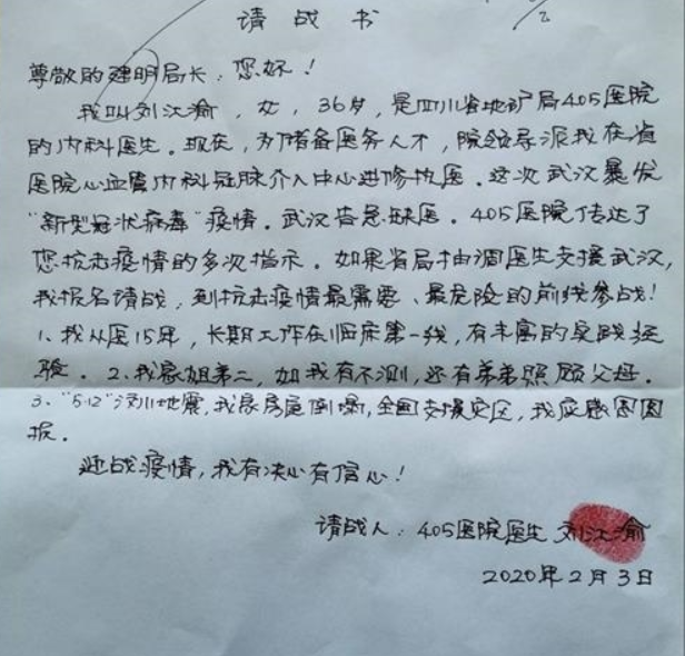 请战书上,刘江渝坦承了自己希望去武汉支援的原因。她说,自己从医15年,长期工作在临床一线,有丰富的实践经验:家里有姐弟二认,如自己有不测,还有弟弟照顾父母;“5·12”汶川地震,我家房屋倒塌,全国支援灾区,我应感恩图报。