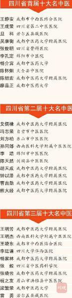 2006年,我省首次开展十大名中医评选活动,这也是全国首次开展省级评选,至今已历时三届,先后有30位德高技精的中医名家榜上有名,成为我省中医领域省级最高荣誉的获得者。“四川省十大名中医的评选,不仅是个人的荣誉,更是对四川中医药高端人才的激励。目的就是希望更多的四川中医人能成为名家、大家。”省中医药管理局相关负责人表示。