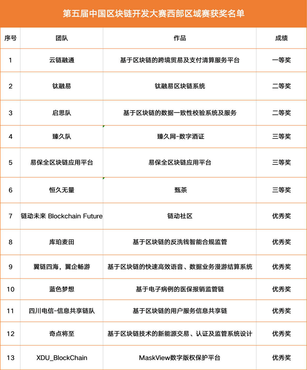 据了解,本届大赛以“标准引领,创新驱动”为主题,由中国电子技术标准化研究院、成都市新经济发展委员会主办,中国区块链技术和产业发展论坛、四川省区块链行业协会承办。经过一天的激烈角逐,比赛决出一等奖1名,二等奖2名,三等奖3名,优秀奖7名,云链融通、钛融易等6支团队入围全国总决赛。