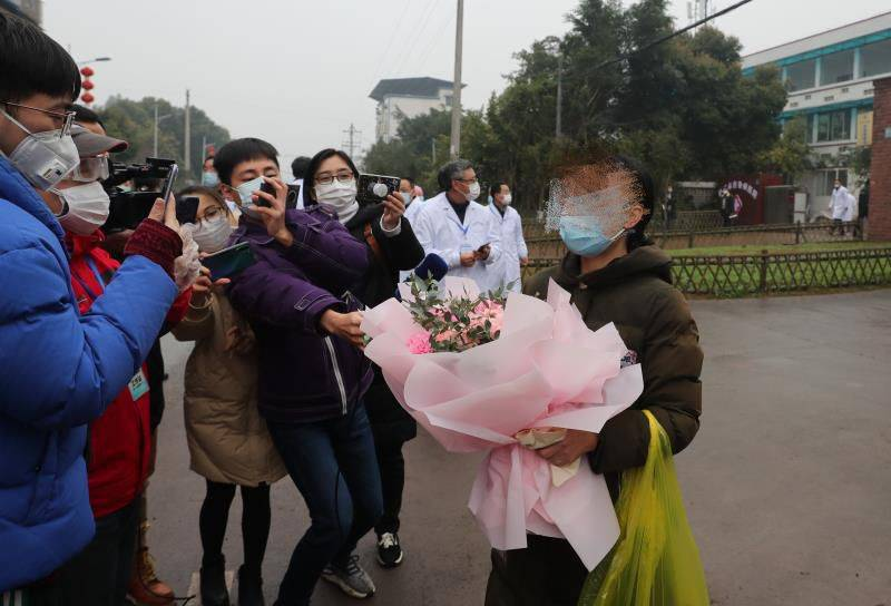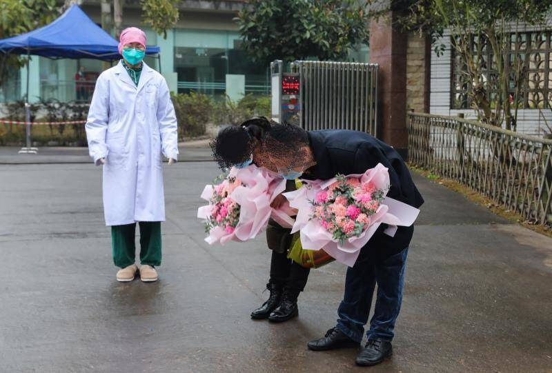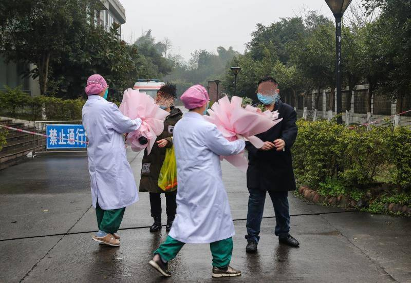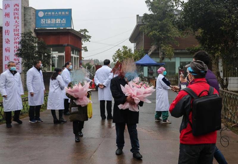 2020年2月8日,四川省泸州市医护人员向治愈出院的两名新型冠状病毒肺炎患者献花。