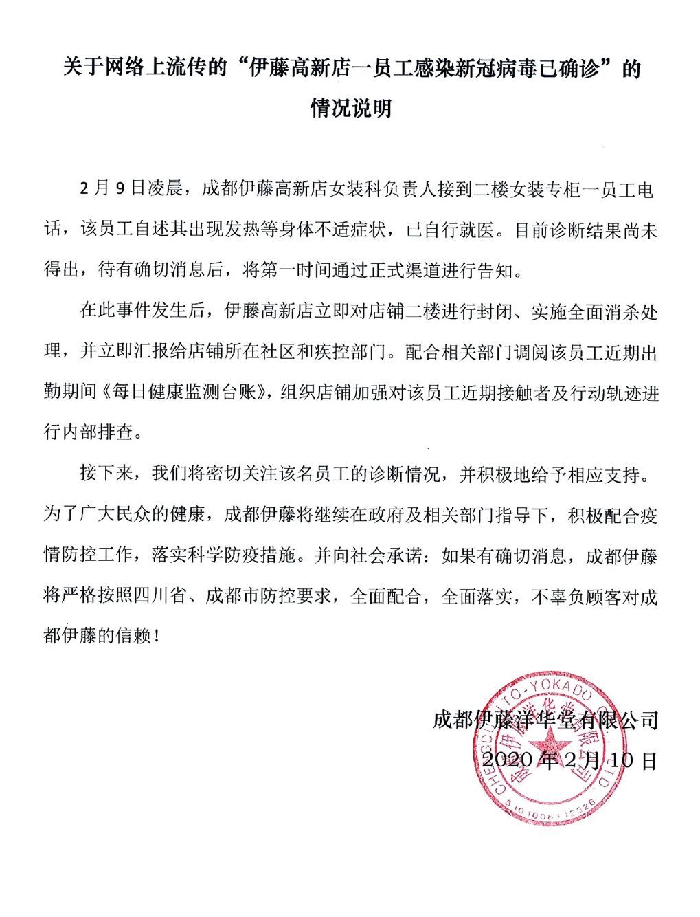 2月10日,成都伊藤洋华堂有限公司发布了一则关于网络上流传的“伊藤高新店--员工感染新冠病毒已确诊”的情况说明。