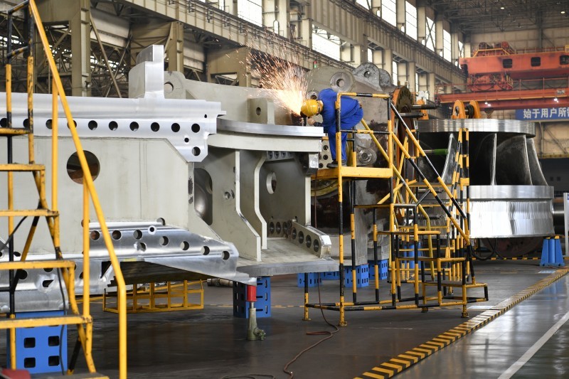 目前,东方电机中核霞浦600MW核电、白鹤滩、长龙山、绩溪等重点项目的生产制造均在持续推进中。在白鹤滩三号机顶盖制造现场,工人们正全副武装进行着焊接等工作。