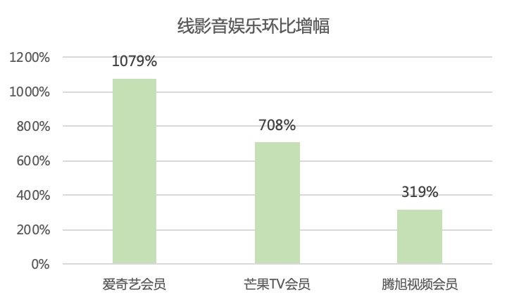 “宅”在家里,网友们更愿意刷剧看电影,畅享在线影音娱乐。我们可以看到,相比疫情爆发前,爱奇艺会员环比增长了1079%,芒果TV会员、腾讯视频会员分别环比增长了708%和319%。这或许与疫情期间大家都不能进电影院相关,宅在家里看视频成了今年热门的娱乐消遣方式。