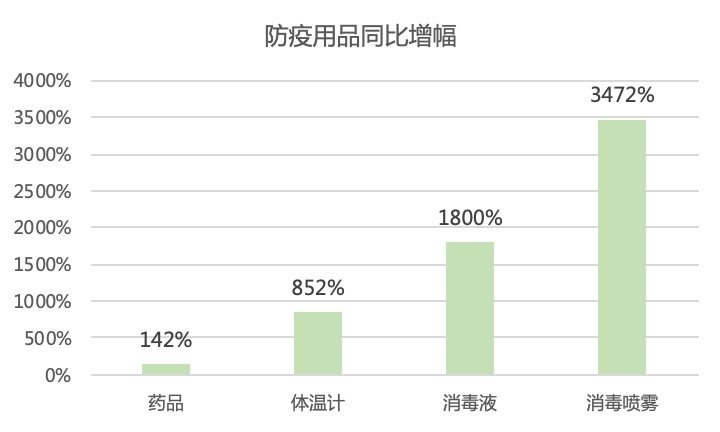 此外,消毒用品也增幅明显,消毒喷雾同比增长了34.72倍,消毒液同比增长了18倍,消毒灯等周边商品也大幅增长。围绕疫情,体温计、药品的订单金额也分别同比增长了852%、142%。不难看出,疫情期间广大网友对于防疫物资消费需求大幅激增,随着节后复工,预期大家对防控物资需求将依旧保持旺盛。