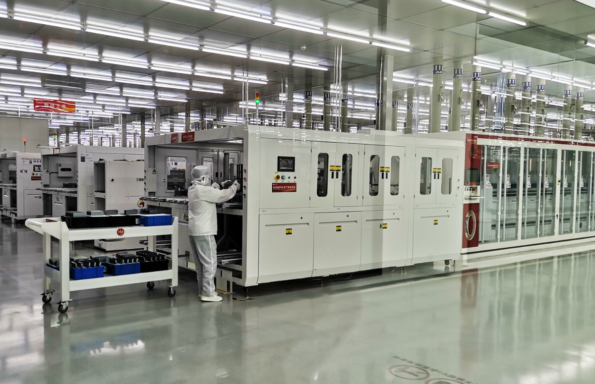 记者透过玻璃看到,车间中,身穿白色无尘服的员工们从头“武装”到脚,有的在调试设备,有的在装卸物料,有的在做测试。偌大的车间内,一列列首尾相对的大型设备占据了大部分空间,高效运行;机械臂摇摆转动,忙个不停。